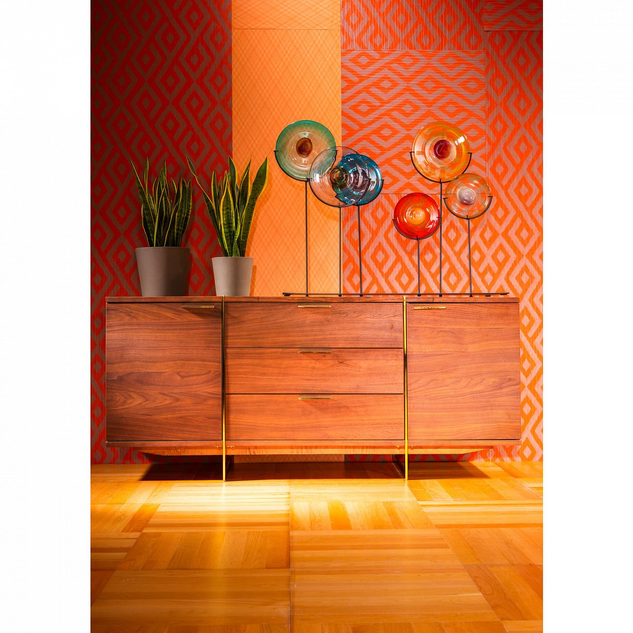Элегантная коллекция в ретро-стиле из шпона орехового дерева, МДФ и стали.