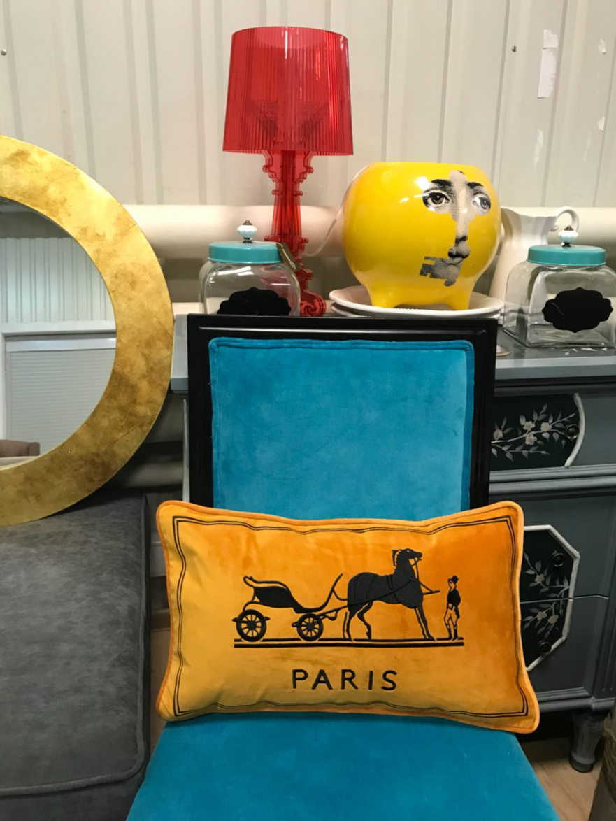 Декоративная подушка с надписью Paris и изображением повозки с лошадью и кучером.